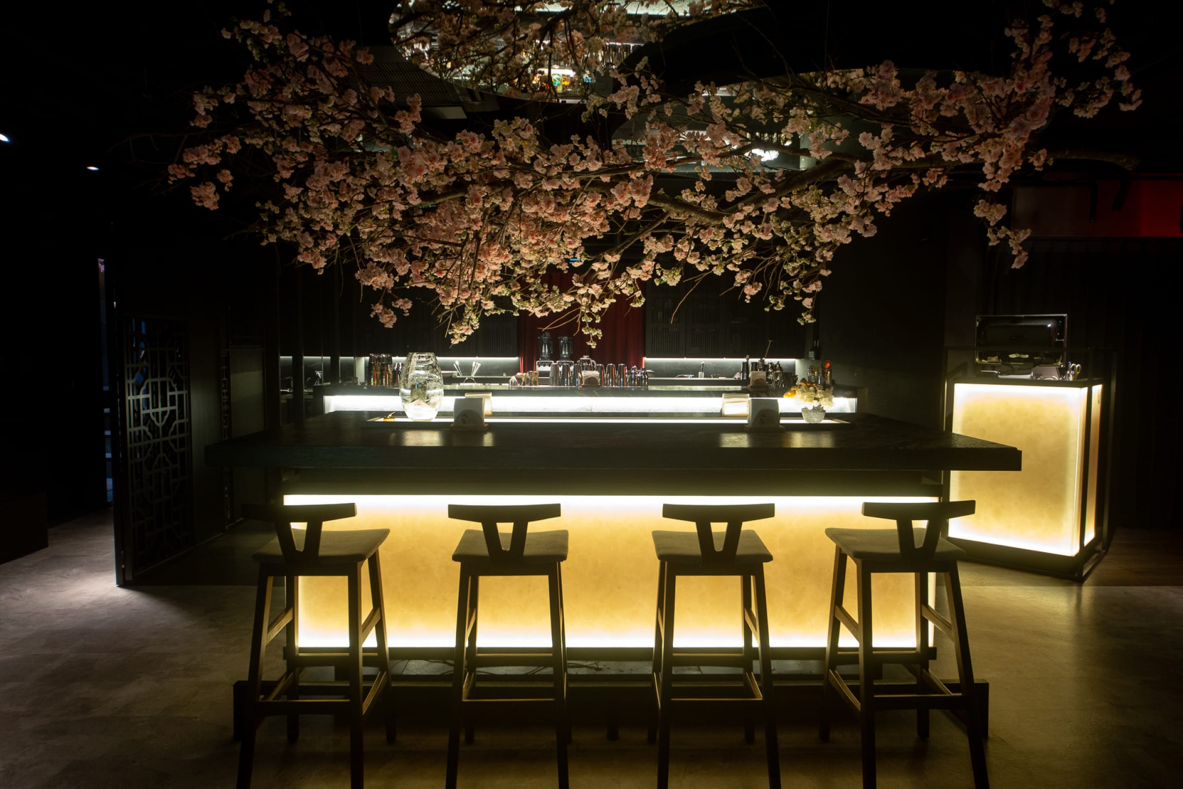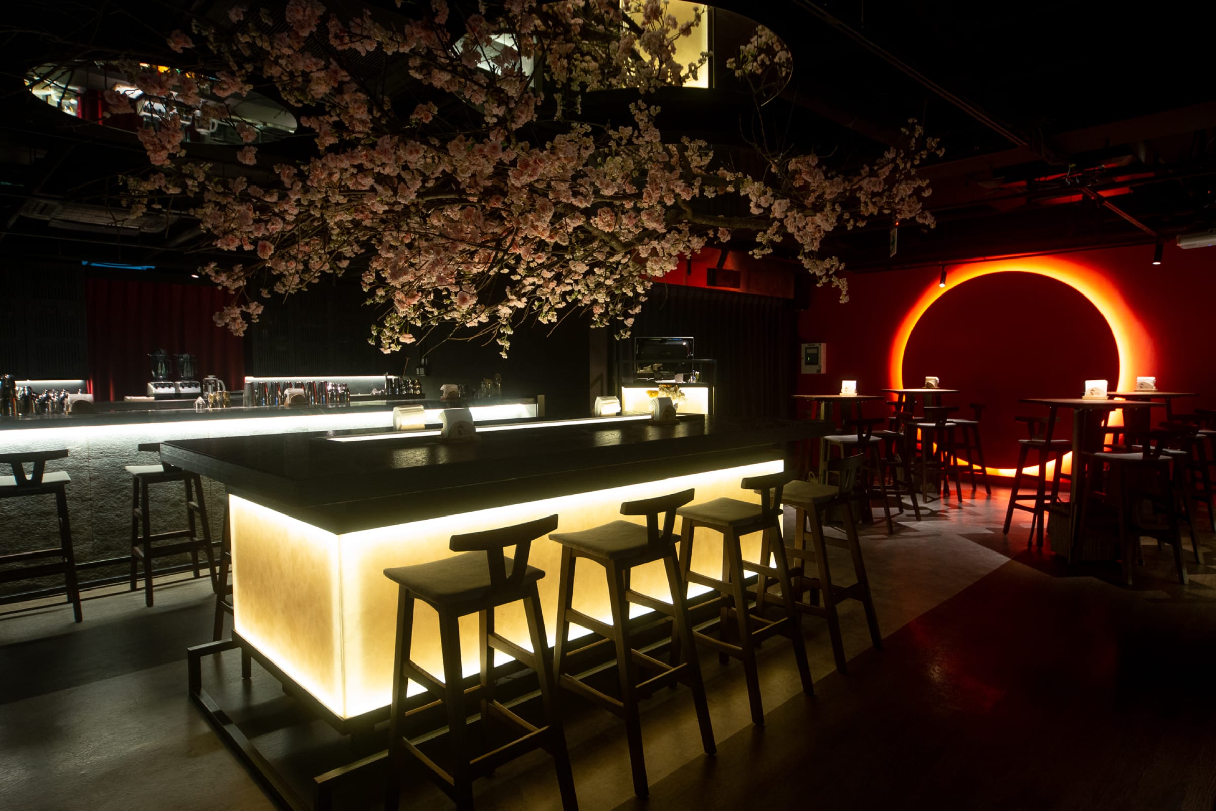 雖然是在地下一樓,但不會找不到路,在旅館門口就可以看到一片恣意盛放的花海,上方有著Bar Weekend的招牌,沿著飯店餐廳向前走就可以看到在樓梯間盛開的櫻花樹,彷彿引領你走進世外桃源般地靜謐。酒吧裡沒有浮誇的裝潢,天花板盛開的櫻花樹中和了吧台、桌椅的線條;而前方的夕陽,可以讓酒客們一邊依傍著落日餘暉,一邊喝著調酒享受恬静幽雅的夜半時分。