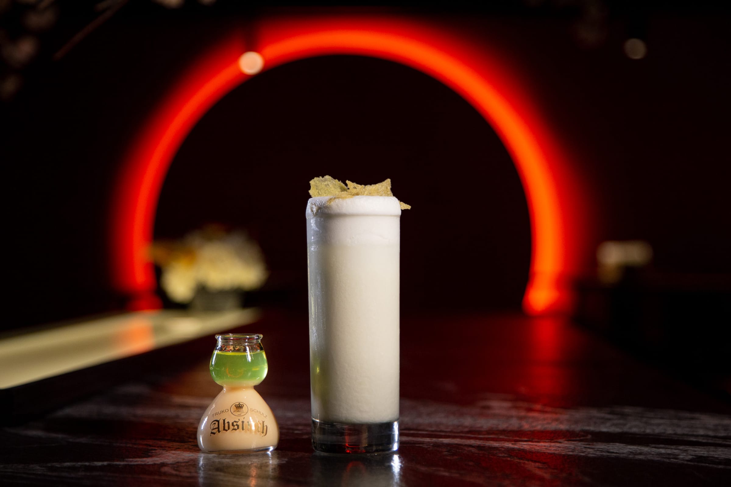 這杯艾碧斯養樂多炸彈顧名思義就是艾碧斯+養樂多,底下先加入養樂多至中線,再緩慢加入艾碧斯,利用糖分與酒精的比重關係,讓艾碧斯漂浮在炸彈杯的上層。欣賞完漂亮的漸層炸彈後,就可以「一口」把它乾掉,雖然剎那間會先被艾碧斯的高酒精濃度嚇到,但緊接而來養樂多的乳酸口感會和艾碧斯的藥草香氣結合,最後嘴裡只會留下溫馴的八角氣息及養樂多的酸甜滋味!(冰冰的艾碧斯一點都不恐怖,所以拿到Shot請馬上喝掉~)