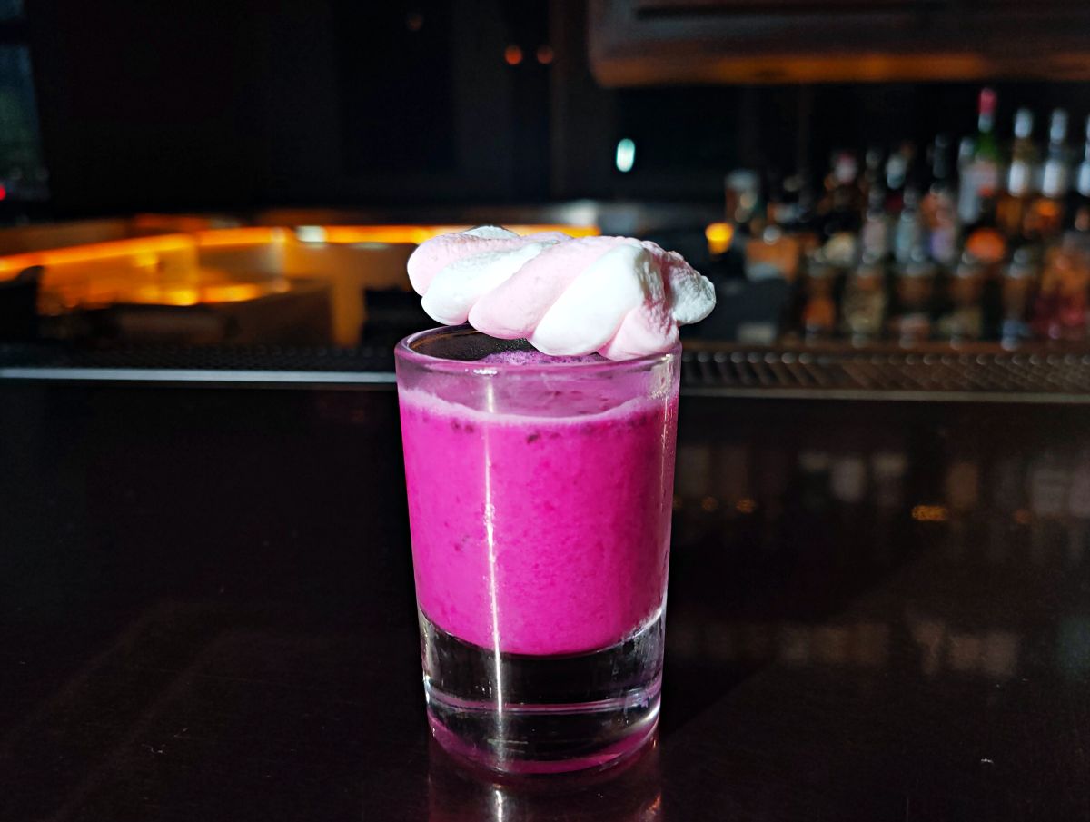 而這杯「Pink Shot」是用紅火龍果為主體,還帶有接骨木花的香氣,裡頭還混合了鮮奶油提升它的滑順口感,喝起來就像是在喝一杯火龍果汁,配上一顆可愛的烤棉花糖,那少女心完全噴發啦~