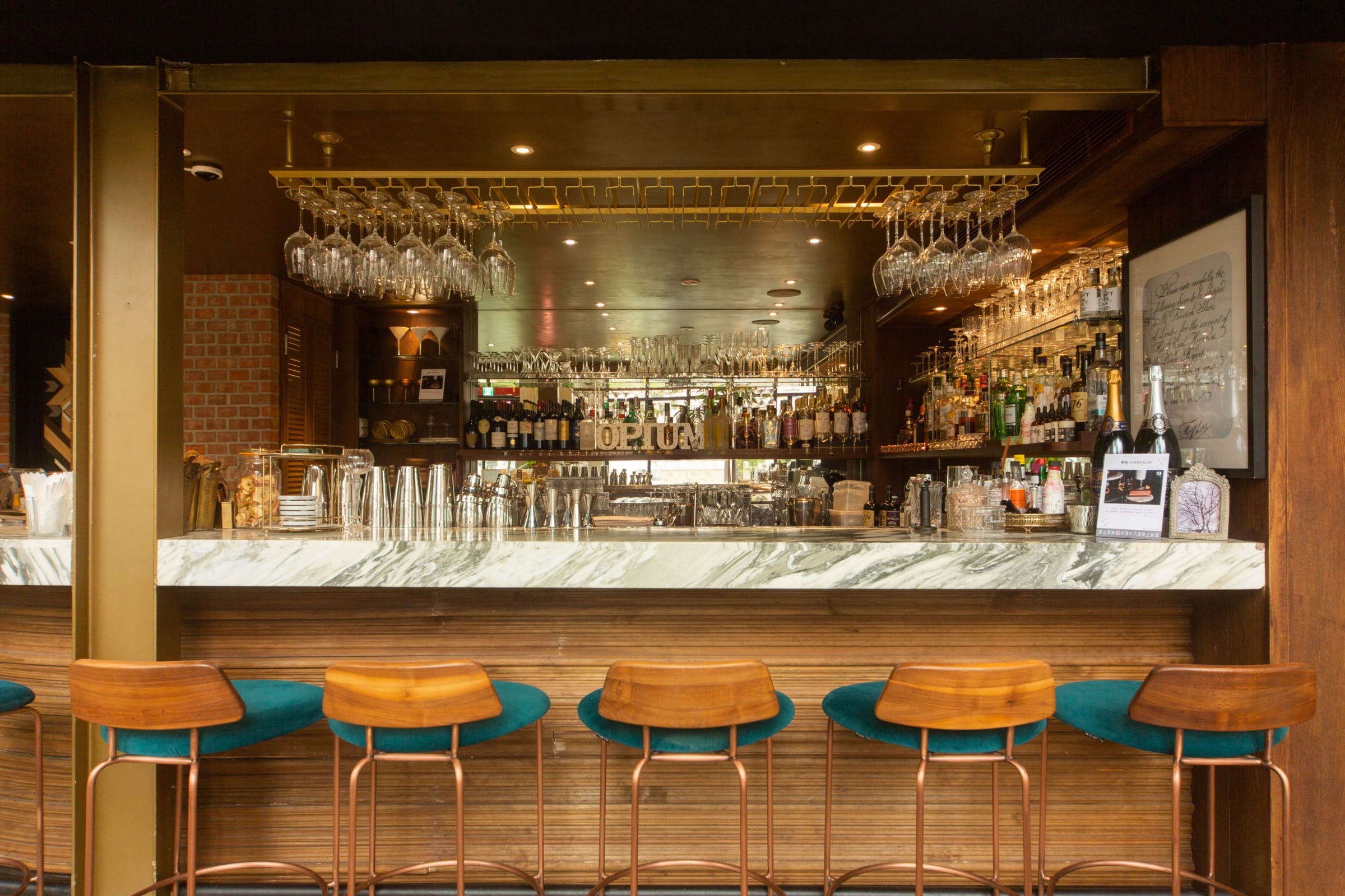 店內共有兩層樓,走上2樓映入眼簾的是更多不同的絨布沙發座,散發著迷人的時尚魅力,以水晶吊燈籠罩的奢華氛圍,並以錯落的綠色植栽點綴店裡每個角落,富貴中帶著些微的活潑氣氛,店裡濃厚的歐式風情,真是讓人不想離開呢~吧台是以大理石打造,高掛的酒杯非常高雅、奢華,如果是一個人來喝酒的妞妞們,還可以坐在吧台欣賞帥氣又迷人的Bartender(喂)~喝到最後都不知道是酒精醉身,還是Opium謝霆鋒的顏值醉心。