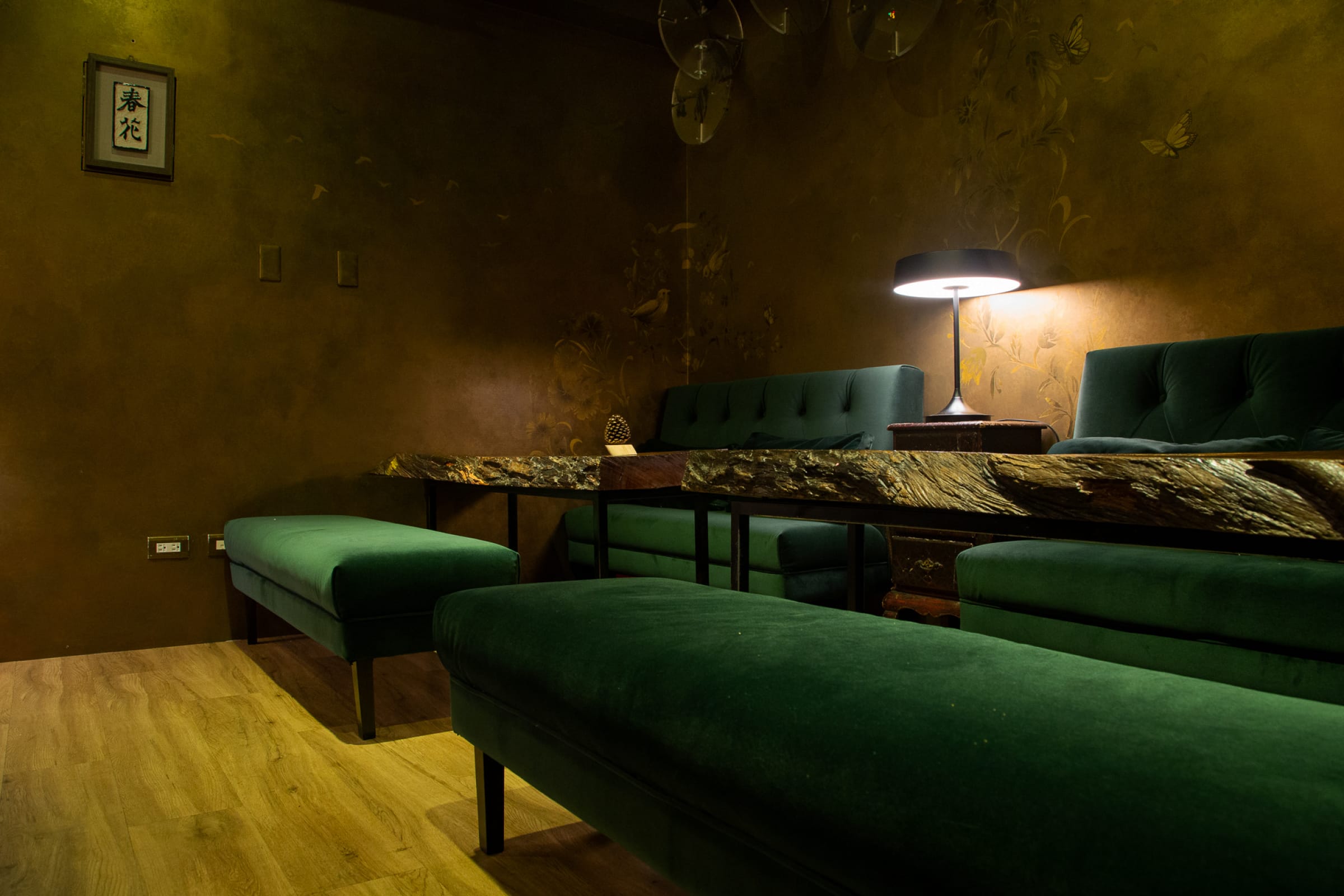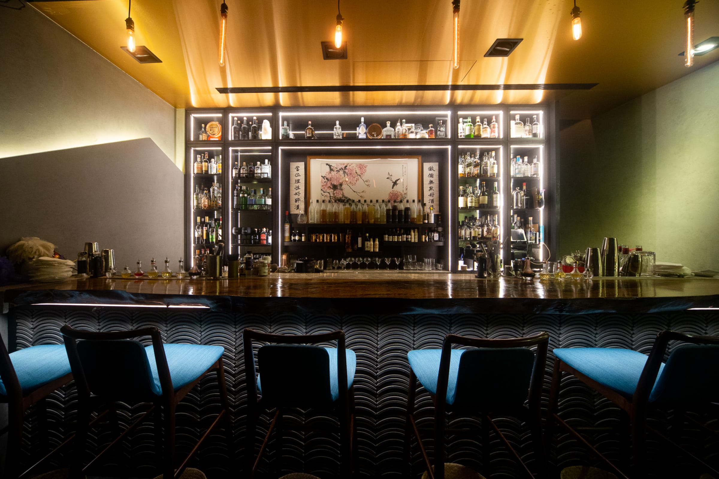 不知道是不是因為Dale本身的氣質的關係,店內的裝潢使用了坊間比較少有的國畫、中式茶櫃與花鳥彩繪元素為主體,搭配上實木、大理石等自然素材,整體設計讓人耳目一新,最有趣的就是他在吧台前自提的對聯「做個無欺好酒保,當位理性好醉漢」。