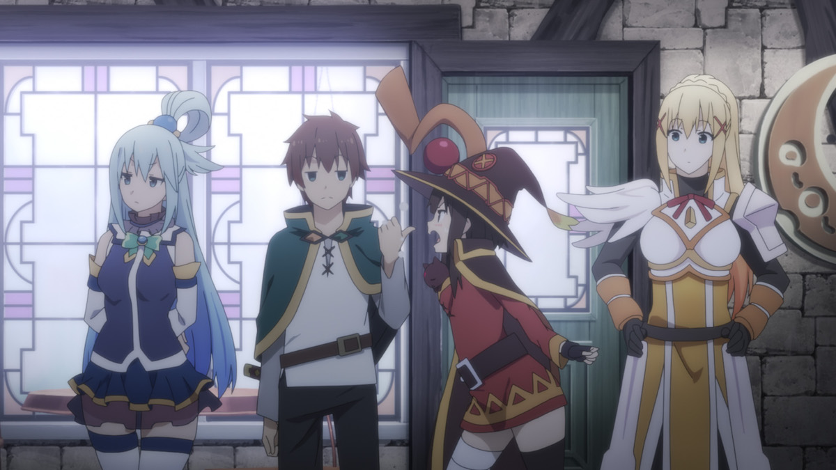 和真跟三個能力高超卻無可救藥的人結伴行動,包括廢物女神‧阿克婭、魔法師‧惠惠、女騎士‧達克妮絲,發不生少事件。